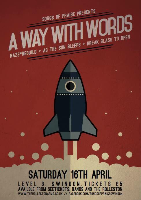 last year as their brand of accessible alt-rock, incendiary riffs and killer tunes took them from local concerns to regional front runners. Imagine where they will be by the end of this year. Raze*Rebuild are another band cashing in on last years hard work and whose punked out Americana will resonate with fans of Chuck Ragan, Gaslight Anthem and the like. As The Sun Sleeps bring a hefty slice of pop punk to the night, infectious rhythms, killer grooves and more energy than is good for them. Damn these pesky youngsters. Opening proceedings are young newcomers Break Glass To Open, four lads from Swindon and Marlborough with a thing for anthemic indie and punk bands. Hotly tipped by The Academy Of Music & Sound.